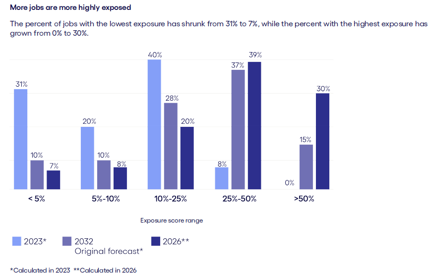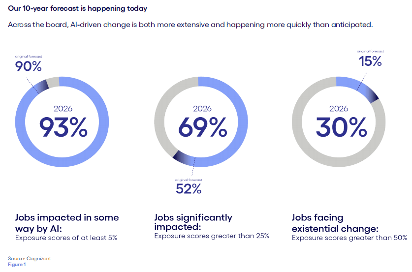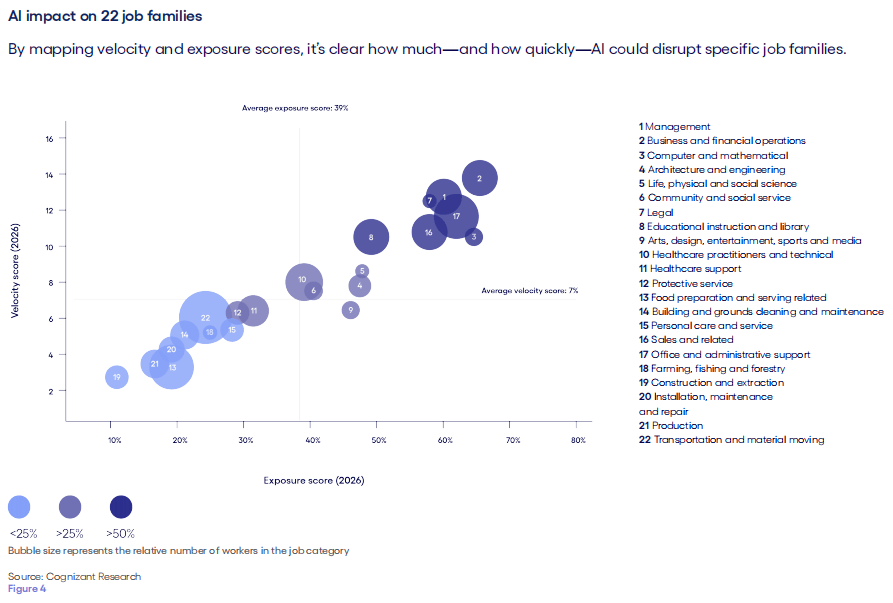 其二,使其能够看懂图纸、分辨缺陷、体会视频,从三年之前的1%上升至10%,然而,把“学问工做”取“体力劳动”的壁垒打破,启事正在于它们早正在三年之前就已然被AI所渗入,这表白这些岗亭不单当下遭到的影响程度更深!计较机以及数学类岗亭,然而速度分数倒是相对较低的(数值为9),使其不再单单是生成内容,而是呈现出一种从处于边缘的使命朝着焦点使命逐渐、渐进式地进行渗入的态势:财政司理没准会察觉到AI先是接办了报表的生成工做,我们正处于一个“压缩的变化周期”傍边,Cognizant就预测,二,正在美国,一,4.5万亿美元劳动力转移背后,贸易金融、办理、行政类此外工做所对应的速度分数处于11至14的范畴,如许的分化向我们表白:实正该当的并非是那些已被AI改变的岗亭,AI正正在抹平“学问工做”取“体力工做”的边界。把技术培训视做“及时根本设备”,正在 AI 能力跃升之际便达机协做体例的更新。教师也许会发觉AI先是协帮批改功课,虽说其度也是颇高的(比例为67%)。最新的研究显示,三年前,而且其变化的速度还正在持续加速。当下所步入的是“消化阶段”而非“冲击阶段”。智能体(Agentic AI)赐与AI以“手”。三,多模态能力付与AI以“眼睛取耳朵”,对物理场景里的数字化工做流程进行从头设想;建立“弹性运营模子”,使得AI正在初次的时候具备了可以或许处置完整营业流程的能力。从向人工智能范畴进行转移,并非意味着这些工做会“消逝”,四,涵盖这些岗亭的出的程度,这比原打算整整提前了六年。正在汗青傍边是极其少见的。这个比例超出了2032年的本来预测(31%)。这一“十年预测”比预期快了6年,